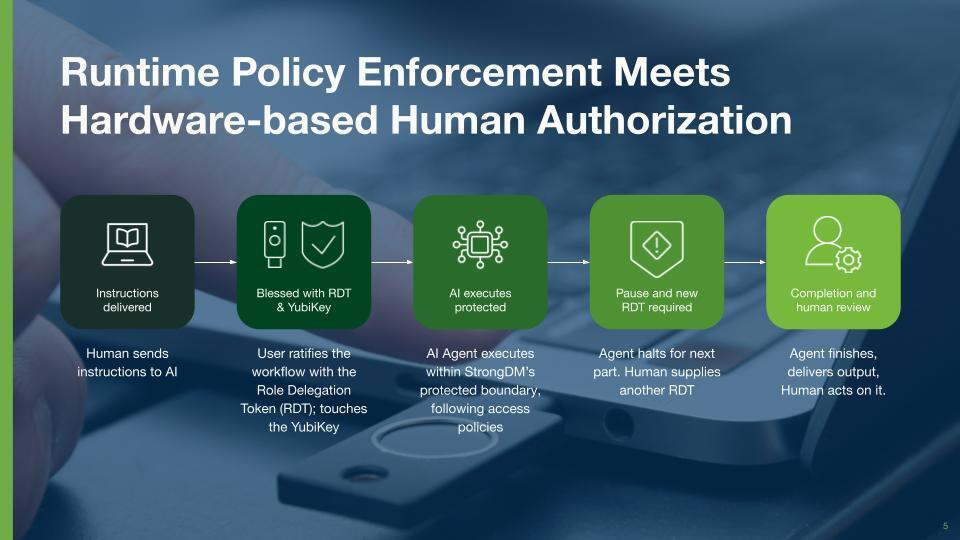 Following Delinea’s completion of its StrongDM acquisition, the combined platform unifies Privileged Access Management with just-in-time runtime authorization across both human and non-human identities. Yubico’s RDT adds a cryptographic hardware root of trust to this architecture, allowing organizations to establish a verifiable chain of accountability between the human who authorizes an action and the AI system that executes it.