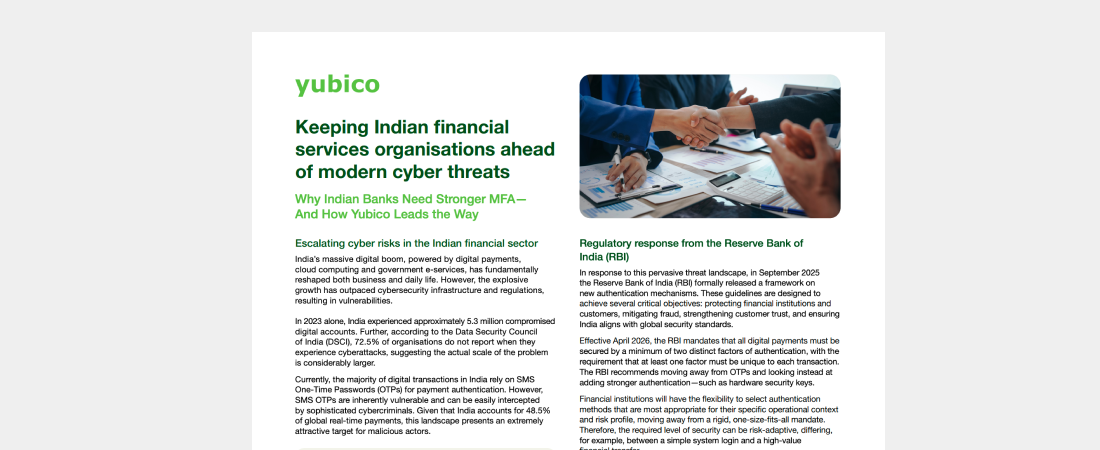 Founded in 2007, Yubico is privately held, with offices in Sweden, UK, Germany, USA, Australia, and Singapore. For more information: www.yubico.com.