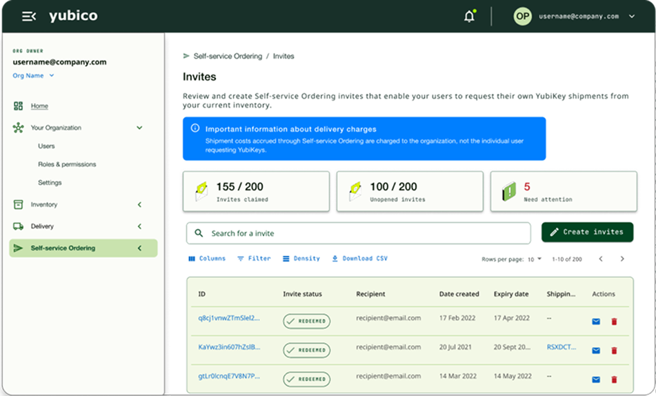 The Customer Portal provides a centralized workspace for managing Self-service Ordering of YubiKeys. Available exclusively through YubiKey as a Service, this capability allows organizations to let employees, contractors, suppliers, and end customers order their own YubiKeys through a simple, guided experience.