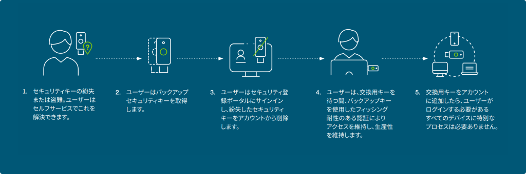 - å®å šãªã»ã«ããµãŒãã¹ãªãŒã»ã³ãã£ã±ãŒã¿ç®¡çïŒãŠãŒã¶ãŒ ãã¢ã«ãŠã³ãããã¯ã¢ãŠãã®ãªã¹ã¯ãåé¿ããããã« æ°ãããã¹ã¯ãŒããå¿ èŠãšããå Žåã«ã远å ã®ããã€ã¹åº å®ãã¹ããŒïŒããšãã°ãYubiKeyäžã«ååšããŠããïŒ ããªãŒããŒããããã®ã»ã«ããµãŒãã¹ããã»ã¹