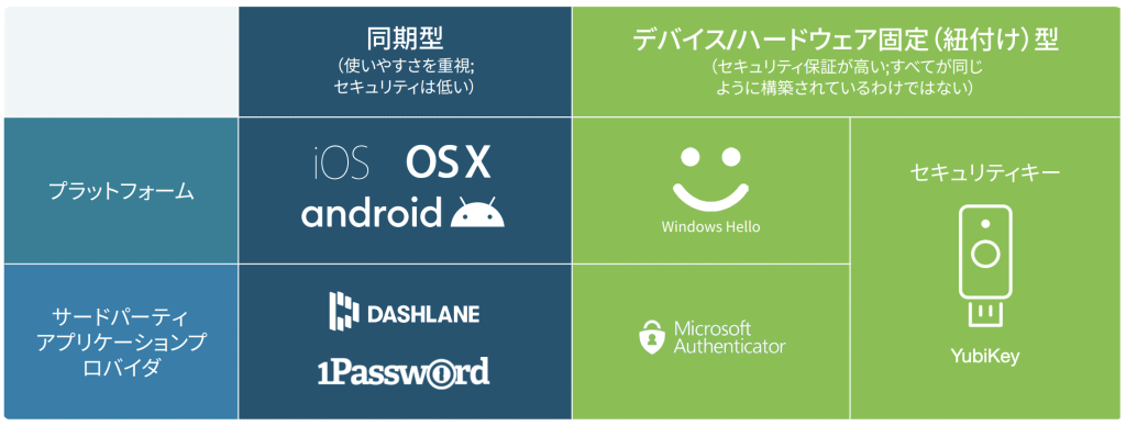 iOSããã³MacOSã§ã¯ããã©ãããã©ãŒã äžã§ã®åæãã¹ããŒã®äœæã®ã¿ããµããŒããããããã«ãªããŸãããGoogle Android ã§ããåæãã¹ããŒã®ã¿ããµããŒããããããã«ãªããŸãããChromeã§ã¯ãåæãã¹ããŒãšããã€ã¹åºå®ãã¹ããŒã®äž¡æ¹ã ãµããŒããããŠããããªã©ã€ã³ã°ããŒãã£ããµãŒãã¹ïŒDropboxãªã©ïŒã§ã¯äœæã§ãããã®ãéžæã§ããŸãããªãã·ã§ã³ã«è¿œå ãããšãWindows Helloã§ã¯ããã®ã¯ãŒã¯ã¹ããŒã·ã§ã³ããã€ã¹ã«çŽä»ãããããã¹ããŒã®äœæã®ã¿ãæå¹ã«ãªããŸãããŸãã 1PasswordãDashlaneãªã©ã®ãµãŒãããŒãã£ãããã€ãã¯ãåæãã¹ããŒãŒã®äœæããµããŒãããŠããŸããåžå Žã«ã¯ããœãã ãŠã§ã¢ã§æ¯æŽããããã€ã¹åºå®ãã¹ããŒããµããŒããããœãªã¥ãŒã·ã§ã³ããããæ°ãã«ç»å Žãããã¹ããŒã«ãããªãé²å±ãèŠã ããŸãã