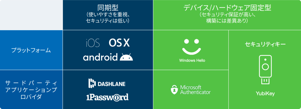 iOSããã³MacOSã§ã¯ããã©ãããã©ãŒã äžã§ã®åæåãã¹ããŒã®äœæã®ã¿ããµããŒããããŠããŸããGoogle Android ã§ããåæãã¹ããŒã®ã¿ããµããŒããããããã«ãªããŸãããChromeã§ã¯ãåæåãã¹ããŒãšããã€ã¹åºå®ãã¹ããŒã® äž¡æ¹ããµããŒããããŠããããªã©ã€ã³ã°ããŒãã£ããµãŒãã¹ïŒDropboxãªã©ïŒã¯äœæãããã®ãéžæã§ããŸãããã® ãªãã·ã§ã³ã«å ããŠãWindows Helloã§ã¯ããã®ã¯ãŒã¯ã¹ããŒã·ã§ã³ããã€ã¹ã«çŽä»ãããããã¹ããŒã®äœæã®ã¿ã æå¹ã§ãããŸãã1PasswordãDashlaneãªã©ã®ãµãŒãããŒãã£ãããã€ãã¯ãåæåãã¹ããŒã®äœæããµããŒãããŠã ãŸããåžå Žã«ã¯ãã¢ããªã«ããããã€ã¹åºå®ãã¹ããŒããµããŒããããœãªã¥ãŒã·ã§ã³ããããããã¯ãã¹ããŒã®æ°ããªå° å¹³ã«ããããã1ã€ã®æ°ããçºå±ã§ãã