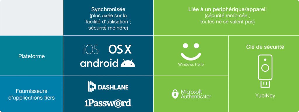 Par conséquent, le type de système d’authentification sur lequel un utilisateur doit stocker ses mots de passe peut varier en fonction de la sensibilité de son poste, ou du type de données ou système auquels il doit accéder. Les clés de sécurité matérielles sont des systèmes d’authentification portables spécialement conçus pour la sécurité, qui permettent aux utilisateurs de travailler en toute sécurité et en toute transparence dans le plus grand nombre de scénarios d’entreprise. Les authentifications de plateforme sont également intégrées dans les périphériques à usage général tels que les smartphones et les ordinateurs portables. Enfin, les applications mobiles, telles que les applications d’authentification, offrent également des solutions d’authentification pour les utilisateurs. Tous ces systèmes d’authentification présentent des compromis en matière de sécurité et d’utilisation. C’est à l’entreprise de décider du niveau de garantie de sécurité dont elle a besoin et du niveau de risque qu’elle peut gérer.