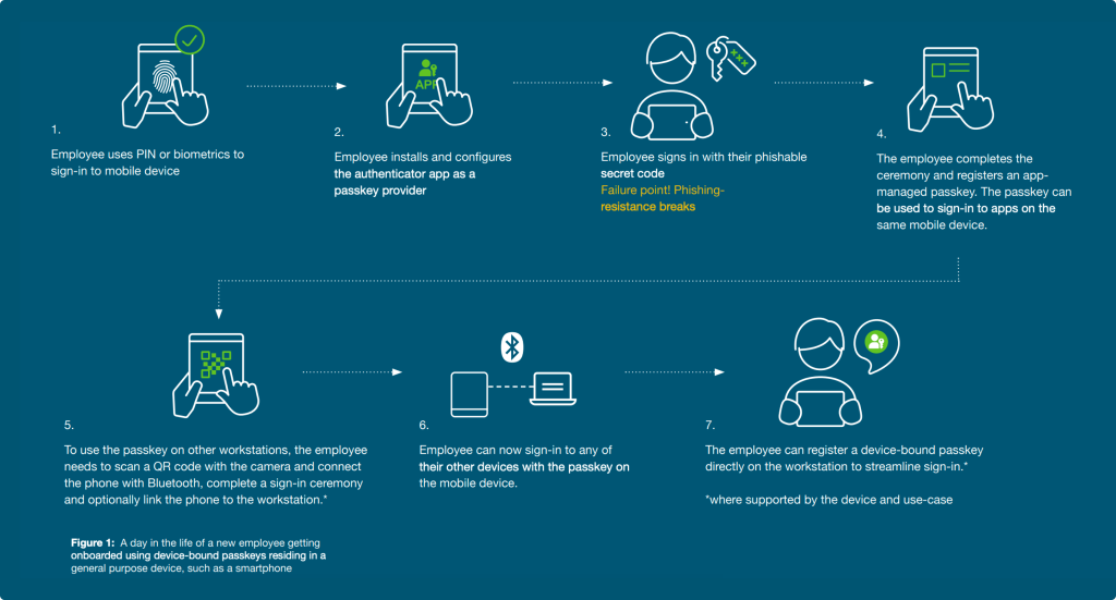 Let’s look at how the different device-bound passkey approaches work for a day in the life of a user in an enterprise as they go through onboarding and credential recovery, as well as at the compliance, audit and risk implications of each passkey approach.