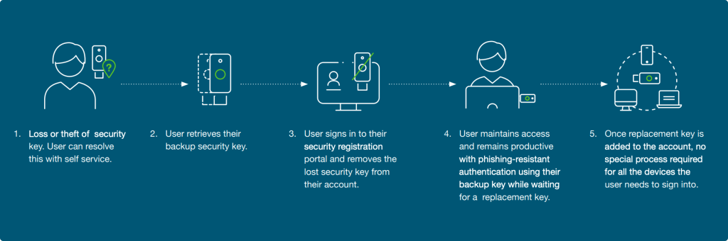 If a user loses their security key, it involves a few steps to recover access to the account. Therefore, each user is advised to maintain a second security key as a backup to maintain account access and to provide a phishingresistant method to add a new backup method