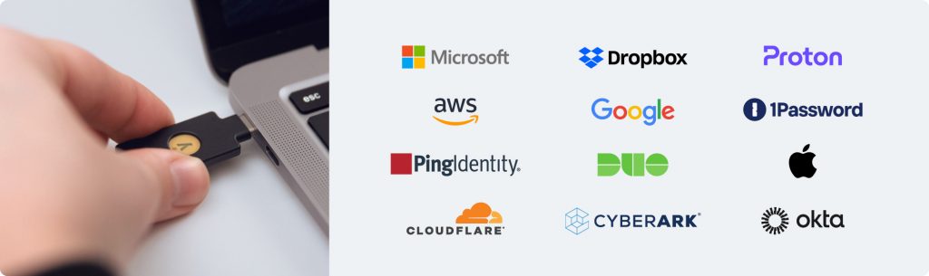 YubiKeys work with leading IDPs, IAM, and PAM solutions and secure user access across 1,000+ of applications and services. Some partners we collaborate with as part of our Works with YubiKey (WWYK) catalog: