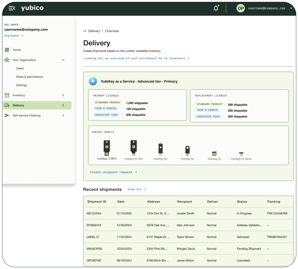 With Delivery services, available through YubiKey as a Service, organizations can easily manage all YubiKey inventory and shipments in the Customer Portal. Clearly see exactly what YubiKeys are available to ship today and track inventory across multiple purchase orders.