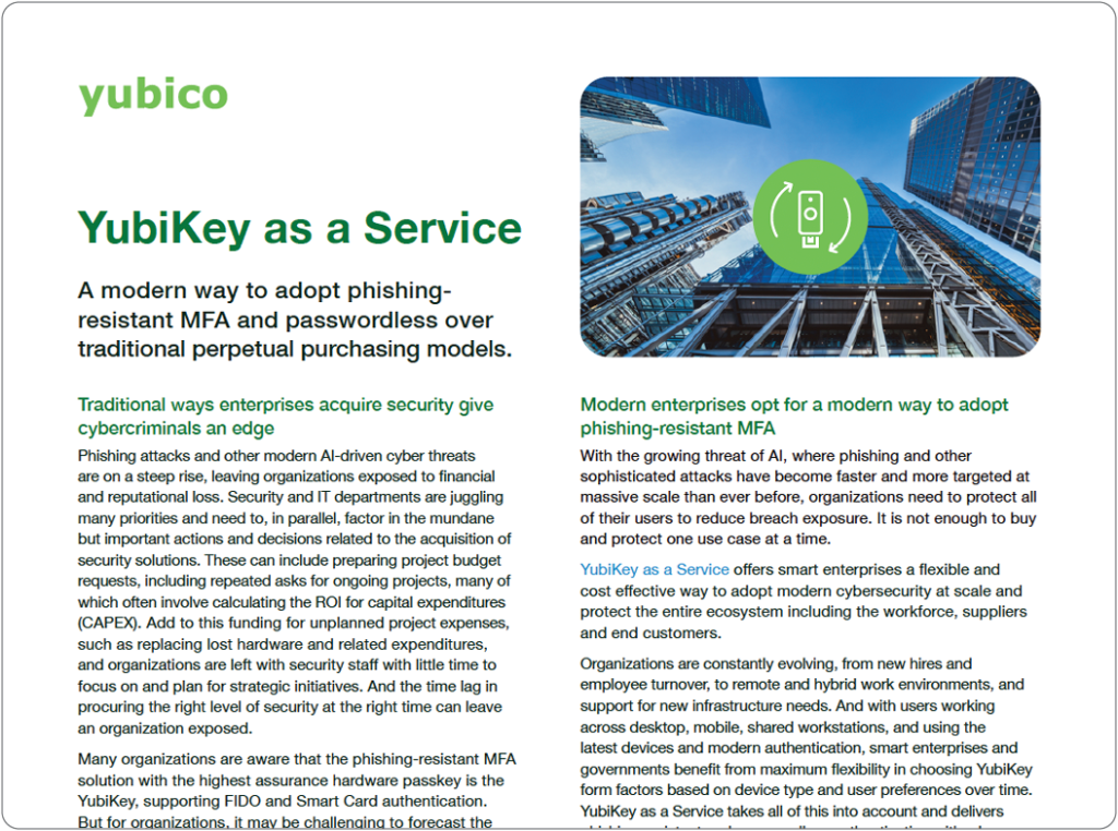 YubiKey as a Service greatly simplifies the acquisition and roll out of phishing-resistant authentication, and saves on costs, for organizations with 500 users or more. Your business needs and employees are constantly evolving, from the addition of new hires and managing employee turnover, to securing remote and hybrid work environments, and supporting new infrastructure needs. And with users working across an array of devices such as desktops, smartphones and tablets, and navigating a range of business scenarios such as being remote or using shared workstations, you benefit from maximum flexibility in choosing YubiKey form factors based on device type and user preferences over time. YubiKey as a Service represents the fastest path to enterprises reducing risk while experiencing digital acceleration by going passwordless.